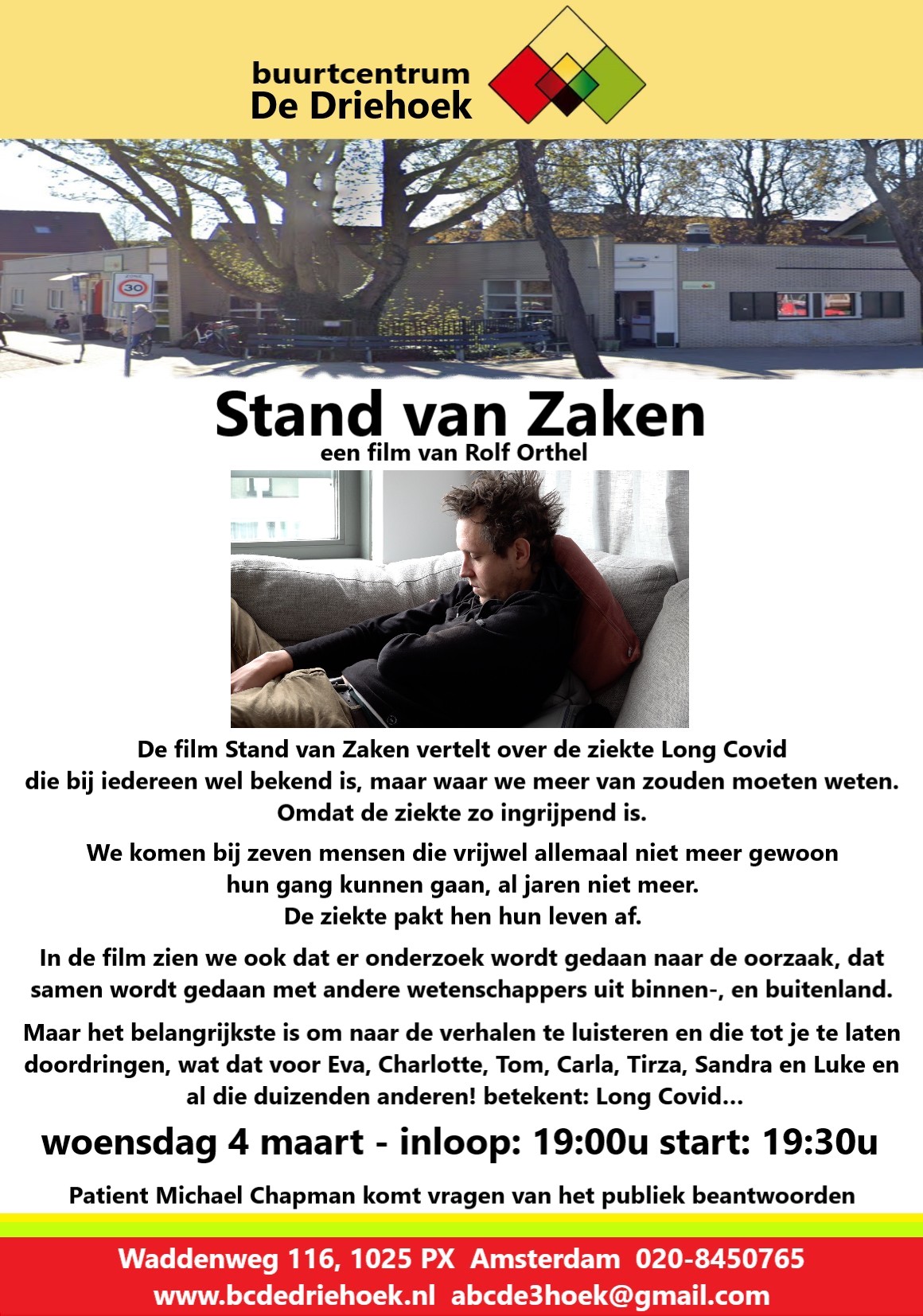 Woensdag 4 maart kunt u de film Stand van Zaken van Rolf Orthel bekijken in Buurtcentrum de Driehoek. Inloop 19:00u start 19:30u